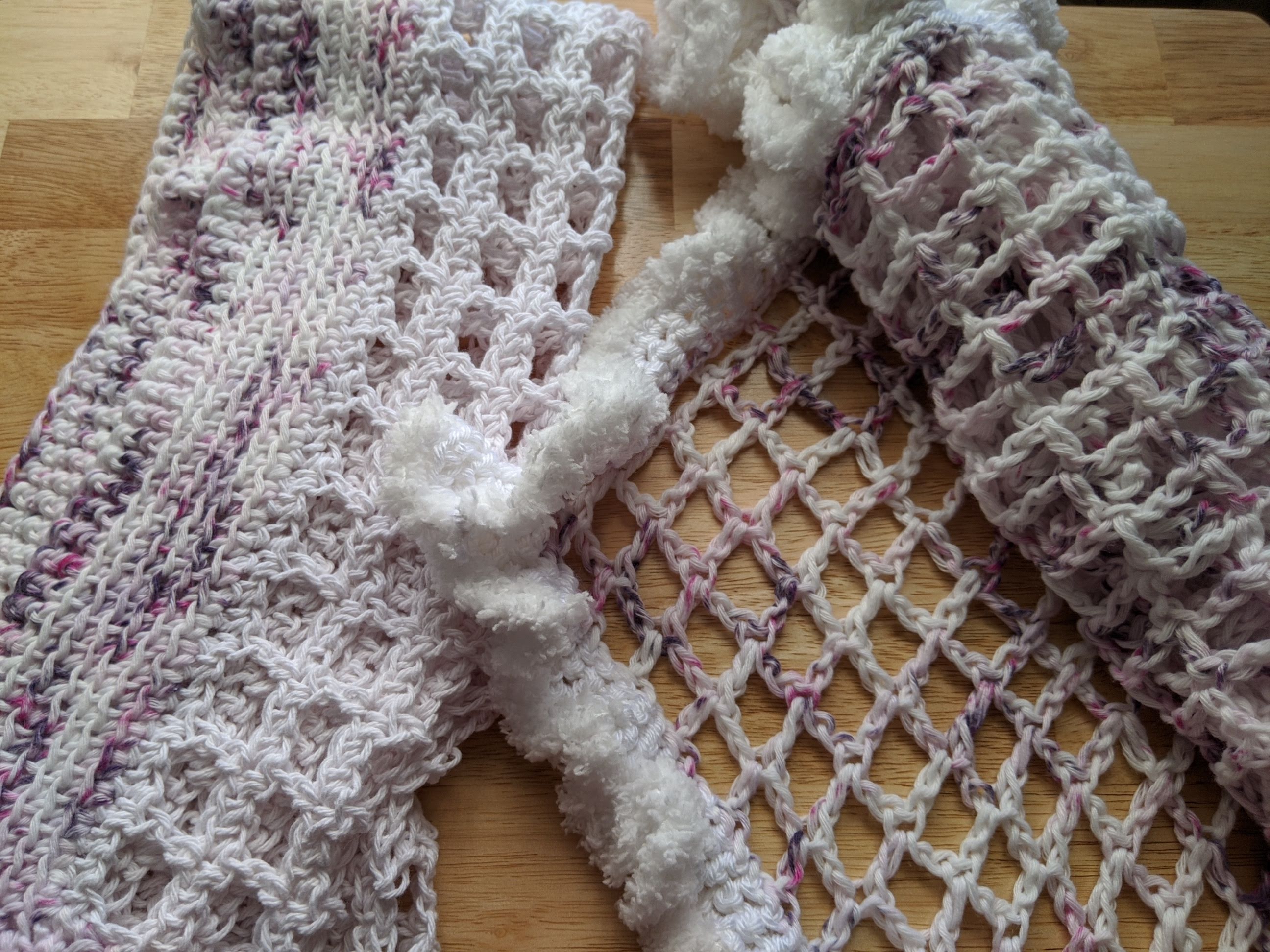 I crocheted this pair of summer'y whites in August, when the sun was blazing hot and I wanted to work with something light and airy. These two lovely ladies seemed perfectly suited for that sunny season. Speckled with pink and purple, they look like how breeziness feels. They reminded me of flowery fresh air. But now that there is snow on the ground, these same two summertime scarves seem even more perfectly suited to this winter'y season.
