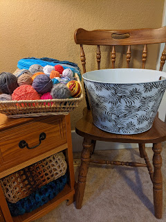 Over the summer, I created so many crochet projects, the leftovers filled up the tray. It became a bit too wobbly to stack any more bits on there, so I had to start a new system. I thought about dumping the whole colorful mess into a crafty bucket... but then I decided not to, because I want to continue looking at that delightful pile. I'm keeping the tray piled as high as I can safely manage (but, oops, every time I take it down from the shelf, one or two escapees roll off), and now I'm tossing all leftovers into this handy bin. I should probably put escapees here, too. 😁