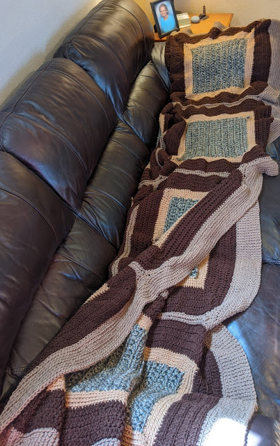 I know my way around big projects. I've made a few here and there. 😎 Like, say, oh, maybe something kinda like Ruffle Monster or Granny Square Greatness. 🤩 But I knew this napping-on-the-couch piece had to be just a bit different... a style befitting an old Army guy, and comfy cozy enough to be snooze friendly. So originally on this adventure, I had a concept for a large square blanket, of 3x3 granny squares. I did end up making all nine squares, extra large. Each square starts with a bulky weight yarn in camouflage, sc for 20 rows. That was then doubly framed with two medium weight yarns, first tan (sc four rows) then brown (dc four rows). The variation is colors, weights, and textures created a fantastic look and feel to each piece, I knew it was going to be awesome all pieced together. But when I set it all out for a test arrangement (with Frank in napping position on the couch) I immediately saw my error. Of course it needs to be a long rectangle, not a square blanket. No problem. I connected eight of the squares in a 4x2 arrangement, and I have the one square left over for a pillow. (Working on that piece right now! Stay tuned.)